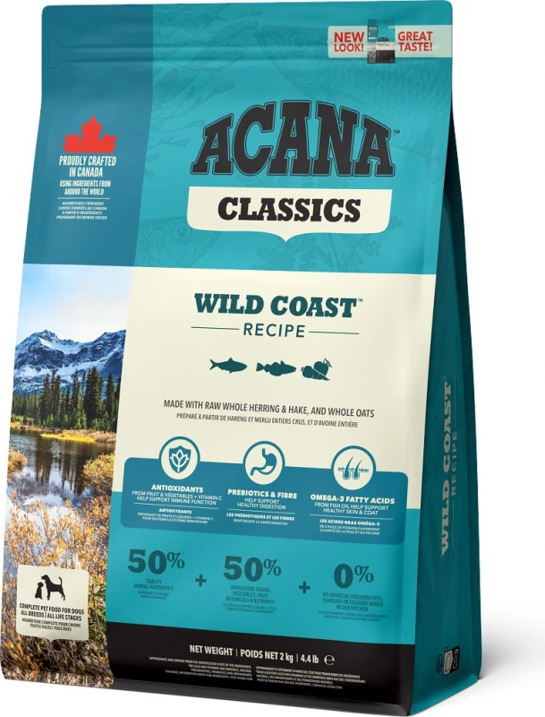 Acana Classics Wild Coast hondenvoer is gebaseerd op vlees en vis. Een hond is oorspronkelijk een carnivoor en zijn lichaam is dus aangepast op het eten van voornamelijk vlees, vis en een beetje groenten, fruit en grassen. De Wild Coast variant van Acana Classics is gemaakt van pacifische haring, pijltandheilbot en zilverheek. Deze vissen geven veel eiwitten en dit is goed voor de opbouw en het onderhoud van spieren. De aanwezige omega-3 vetzuren ondersteunen de conditie van je hond. Het voer bevat laag-glycemische havergrutten en deze zorgen voor een gezonde bloedsuikerspiegel en een vermindering in de opslag van vet. Acana Classics Wild Coast hondenvoer bevat geen geur-, kleur- en smaakstoffen.
