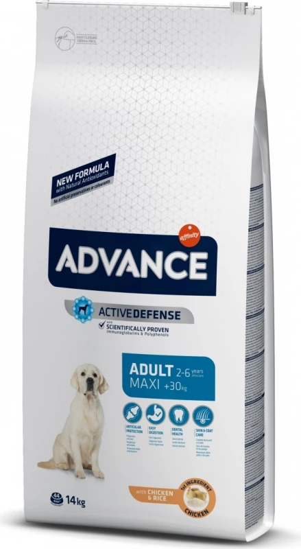 Advance Maxi Adult Large Dog Food with Chicken wordt aanbevolen voor volwassen honden (2 tot 6 jaar oud) van groot formaat (meer dan 30 kg). Ze hebben een eiwit- en vetgehalte dat perfect is aangepast om een optimale gezondheid voor grote volwassen honden te garanderen.