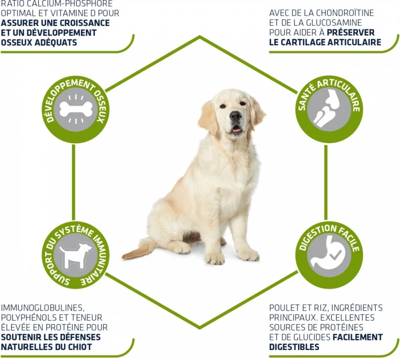 – Omega 3-vetzuren dragen bij aan de goede ontwikkeling van het gezichtsvermogen en het centrale zenuwstelsel van jonge honden.