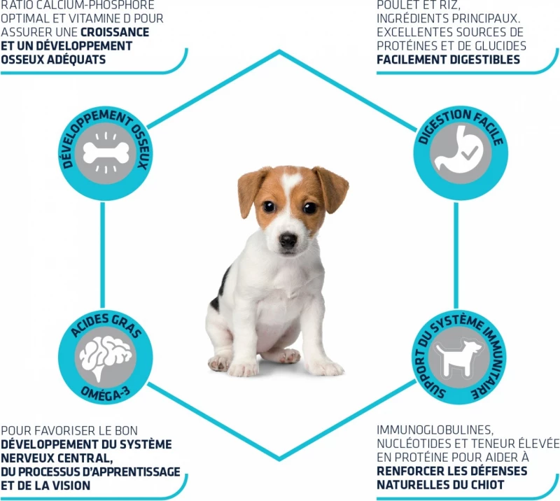 – Optimale calcium / fosforverhouding voor perfect puppy skelet groei.