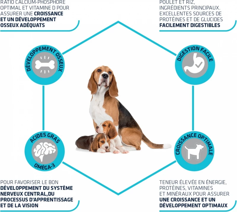 De combinatie calcium-fosfor is perfect voor de groei van het skelet van de pup.