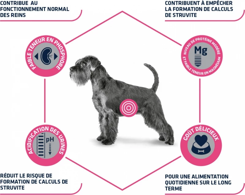 – Vermindert de oververzadiging van de ionen die de struvietstenen vormen.