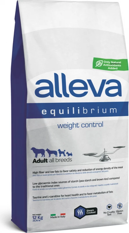 ALLEVA Equilibrium Weight Control brokjes voor volwassen honden zijn speciaal ontwikkeld voor honden met neiging tot overgewicht! Alleva Equilibrium wordt voorzichtig gestoomd om de kwaliteit van de ingrediënten te behouden. Ze bevatten natuurlijke antioxidanten en hebben een matig gehalte aan dierlijke eiwitten en vetten. Dankzij erwtenzetmeel en bruine rijst hebben deze brokken een lage glycemische index. Ze bevatten veel vezels en weinig vet om een ??snellere verzadiging te bevorderen.