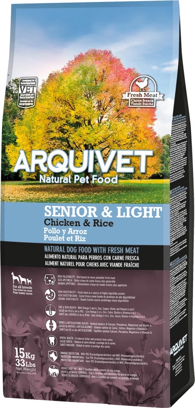 ARQUIVET Senior & Light hondenvoer wordt aanbevolen voor volwassen honden van alle rassen met overgewicht en/of ouder dan 10 jaar. Dankzij een verlaagd gehalte aan energie-inname is dit dieet dubbel functioneel: het bevordert het behoud van een optimaal gewicht bij oudere honden of volwassen honden met overgewicht, of gewichtsverlies bij volwassen honden met overgewicht. De zeer hoge kwaliteit van de ingrediënten en de aanwezigheid van rijst als koolhydraatbron zorgen voor een zachte spijsvertering. De versterkte formule helpt de natuurlijke afweer van je hond te behouden dankzij de manano-oligosacariden die zijn darmflora stimuleren. Omega 3, Omega 6, zink en vitamine A-zuren zorgen voor een gezonde huid en glanzende vacht.