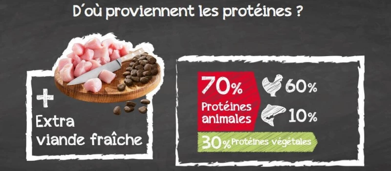 Vers vlees van pluimvee (30%); Amarant (19%); Aardappelzetmeel; Erwtenmeel; Gevogelte lever, gehydrolyseerd (5%); Gevogelte-eiwit, laag in as, gedroogd (3%); Zeeplankton, gemalen (Krill 2,5%); Oceaanvismeel (2,5%); Gelatine, gehydrolyseerd (2,5%); Biergist, gedroogd (2,5%); Verdrijver van druivenpitten; Johannesbroodpeulen, gedroogd; Gedroogde bietenpulp, gezoet; Gevogelte vet; Chia zaad; Calciumcarbonaat; Bicalciumfosfaat; Kaliumchloride; Natriumchloride; Kruiden, gedroogd (totaal: 0,2%; brandnetelbladeren, gentiaanwortels, kleine centaury, kamille, venkel, komijn, maretakkruid, Millefeuille-kruid, braambessenbladeren); Yucca schidigera.