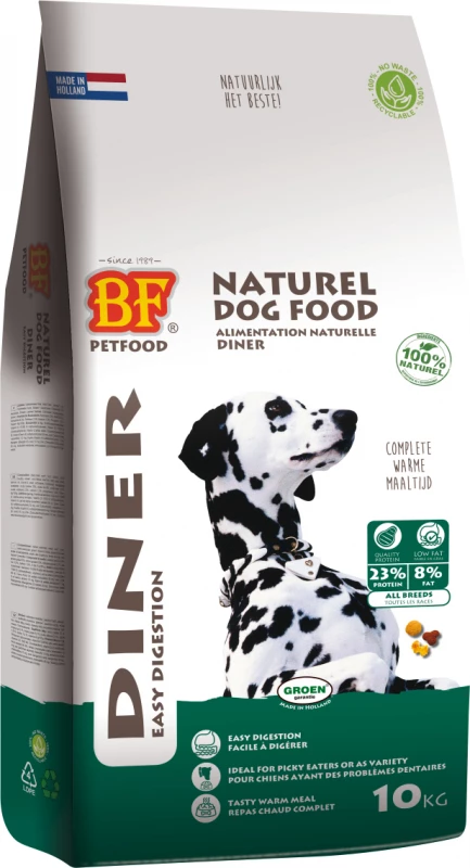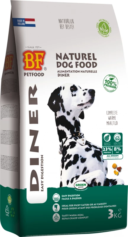 Nederlandse topkwaliteit. Hoogwaardige natuurlijke grondstoffen. Volledige licht verteerbare geëxtrudeerde hondenvoeding voor volwassen honden. Rijk aan rund, kip en rijst. Met gezonde groente, zalmolie en kruiden. Hoge acceptatie en verteerbaarheid. Met gezonde zalmolie welke rijk is aan Omega 3 & 6 vetzuren. Diner kan de voorkeur hebben als een hond niet van brokken houdt, niet goed kan kauwen, slecht eet (“moeilijke eters”), dunne ontlasting heeft of vezelrijk voer moet hebben (bijv. overgewicht > snel vol gevoel.) Optimale voeding die zorgt voor een betere vertering, ontlasting en een goede conditie van je hond. Zonder chemische toevoegingen. Voor alle hondenrassen.