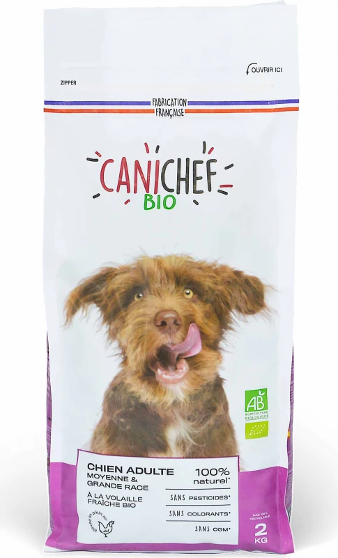 CANICHEF BIO voor Medium / Maxi honden is een compleet en uitgebalanceerd voer dat voldoet aan de behoeften van volwassen honden, vanaf 10 kg. Zonder ggo’s, kleurstoffen of conserveringsmiddelen, zullen deze biologische hondenbrokjes je hond voorzien van alle essentiële voedingsstoffen voor een goede gezondheid. Deze brokjes zijn AB BIO gecertificeerd door de organisatie Ecocert en zijn 100% gemaakt in Frankrijk (in Mayenne). De ingrediënten zijn ook 100% Frans. Het recept is rijk aan fruit, groenten en kruiden (kaolien, plantaardige vezels *, yucca-extract, cichorei *, geëxtrudeerd lijnzaad *, tomaten *, wortelen *, rozemarijn *, salie *, peterselie *, zwarte bes *, aloë vera * . * biologische landbouw) levert de essentiële vitamines en mineralen voor de goede gezondheid van je hond.
