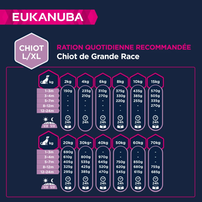 Ten slotte is ons recept, speciaal aangepast voor puppy’s van grote rassen, verrijkt met DHA om het leervermogen van de puppy’s te verbeteren en ze gemakkelijker te trainen te maken. Eukanuba Graanvrij voor puppy’s van grote rassen geeft je puppy een solide basis om uit te groeien tot een gezonde volwassen hond en zorgt ervoor dat veelvoorkomende allergene effecten worden vermeden.