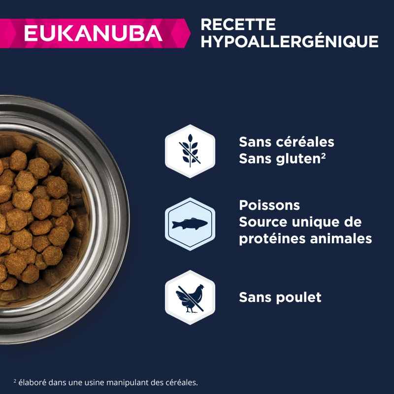 Eukanuba Grain Free * voor volwassen honden van grote rassen is een hypoallergeen recept dat zorgvuldig is samengesteld om veelvoorkomende allergenen te vermijden. De formule bevat glutenvrije zoete aardappel, een natuurlijke bron van vezels, essentiële vitamines en antioxidanten.