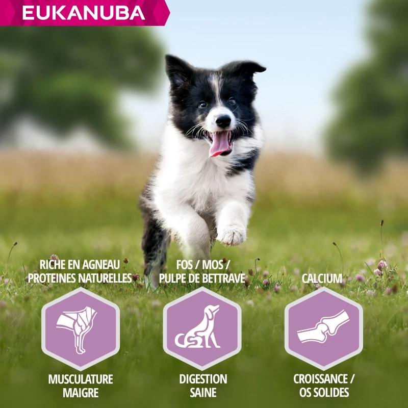 Het nieuwe en verbeterde recept van EUKANUBA is geschikt voor de ontwikkeling van opgroeiende middelgrote puppy’s van 1 tot 12 maanden en biedt hen een compleet en uitgebalanceerd dieet dat groei en ontwikkeling bevordert.