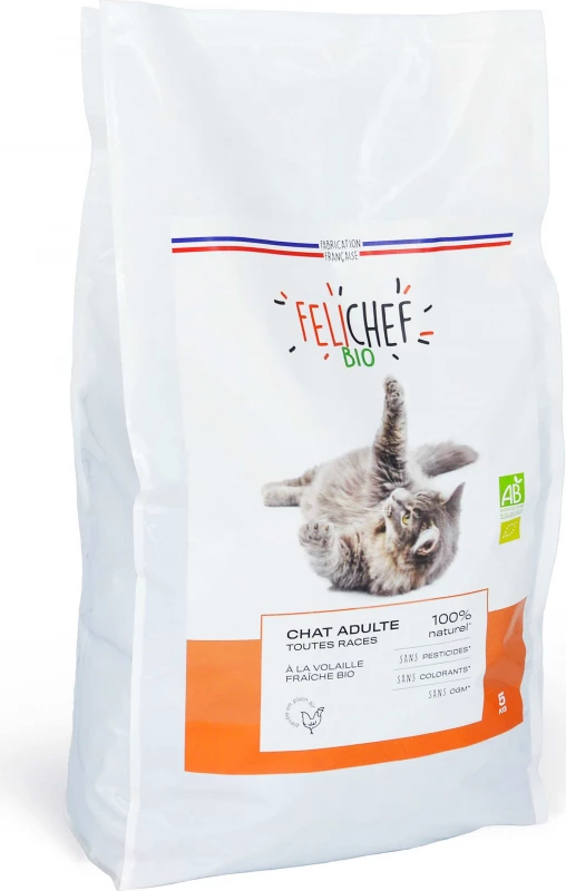 FELICHEF BIO droogvoer voor volwassen katten is een compleet en uitgebalanceerd voer dat voorziet in de dagelijkse behoeften van volwassen katten van alle rassen, vanaf één jaar oud. Zonder ggo’s, kleurstoffen of conserveermiddelen zal dit FELICHEF Biologische kattenvoer je poes voorzien van alle voedingsstoffen die essentieel zijn voor een goede gezondheid. Dit kattenvoer is AB BIO gecertificeerd door de Ecocert organisatie en is 100% made in France (in Mayenne). De ingrediënten zijn ook 100% Frans.