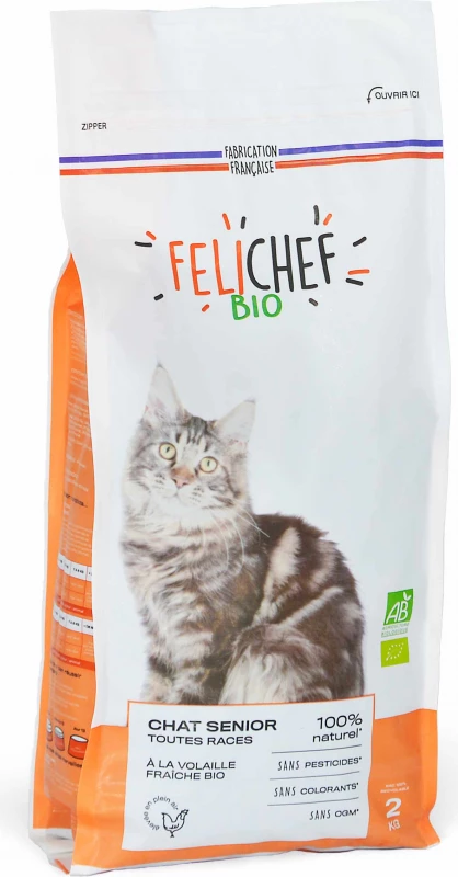 FELICHEF BIO droogvoer voor oudere volwassen katten is een compleet en uitgebalanceerd voer dat voldoet aan de specifieke behoeften van katten ouder dan 8 jaar en van alle rassen. De matige energie-inhoud van deze brokken voorkomt het overgewicht dat minder actieve katten van nature kunnen opnemen. Zonder ggo’s, kleurstoffen of conserveermiddelen, zullen deze biologische brokjes voor oudere katten je poes voorzien van alle voedingsstoffen die essentieel zijn voor een goede gezondheid. Deze brokjes voor oudere katten zijn AB BIO gecertificeerd door de Ecocert organisatie en zijn 100% gemaakt in Frankrijk (in Mayenne). De ingrediënten zijn ook 100% Frans.