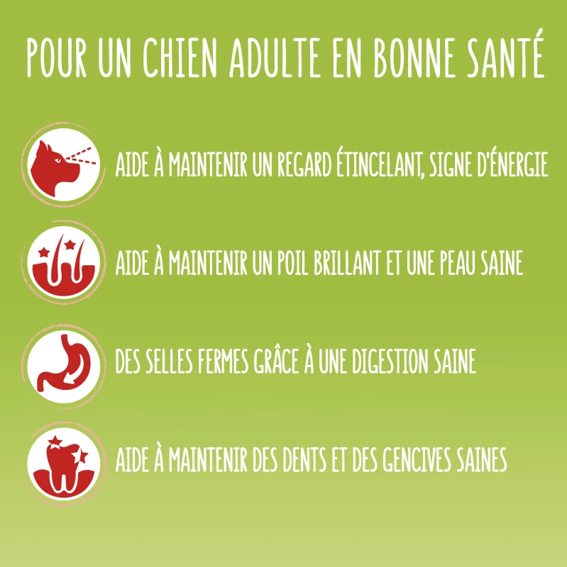 Met rundvlees: Granen (volle granen 64%), vlees en dierlijke bijproducten (8%*), bijproducten van plantaardige oorsprong, oliën en vetten, plantaardige eiwitextracten, minerale stoffen. * Gelijk aan 16% gerehydrateerd vlees en dierlijke bijproducten, met min 4% rundvlees.