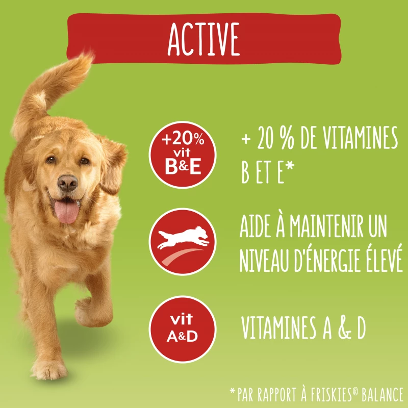 FRISKIES Vitafit Active Beef hondenvoer is gemaakt om je hond vitaliteit te geven! Je houdt van je hond, het enthousiasme en de levensvreugde die hij in je gezin brengt. Daarom wil je ervoor zorgen dat hij altijd levendig en vol energie blijft! Daarom hebben dierenartsen en voedingsdeskundigen van PURINA® FRISKIES Vitafit Active ontwikkeld, een heerlijk, compleet rundvleesrecept met volle granen, vitamine B en Omega 3 & 6. Dit recept is samengesteld voor speelse en energieke honden.