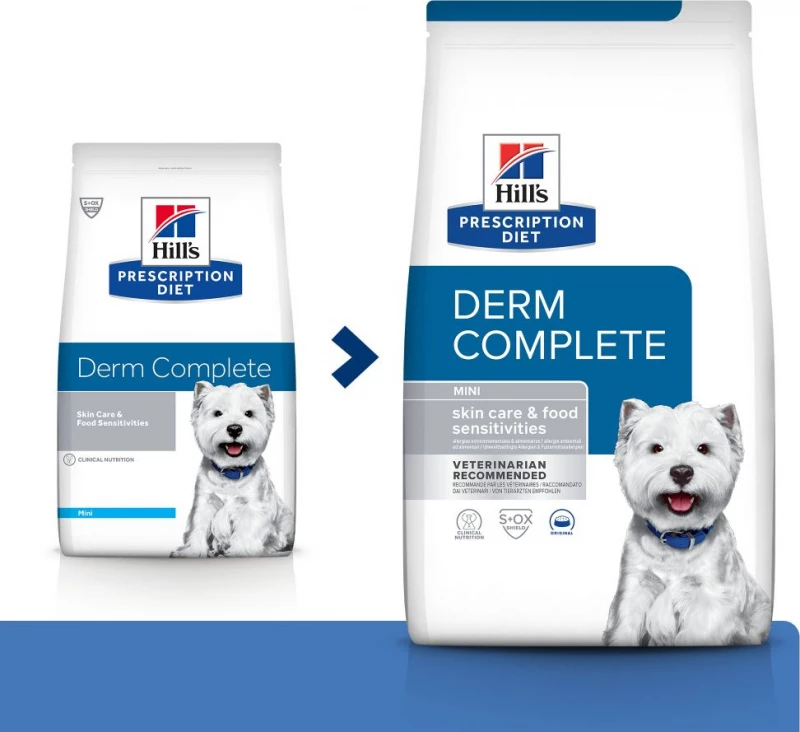 Een voorsprong voor een beter leven. Hill’s PRESCRIPTION DIET Derm Complete Mini Hondenvoer is de enige voeding voor voedsel- en omgevingsgevoeligheden. Helpt bij het beheersen van allergieën, droge huid, jeuk en krabben bij honden.