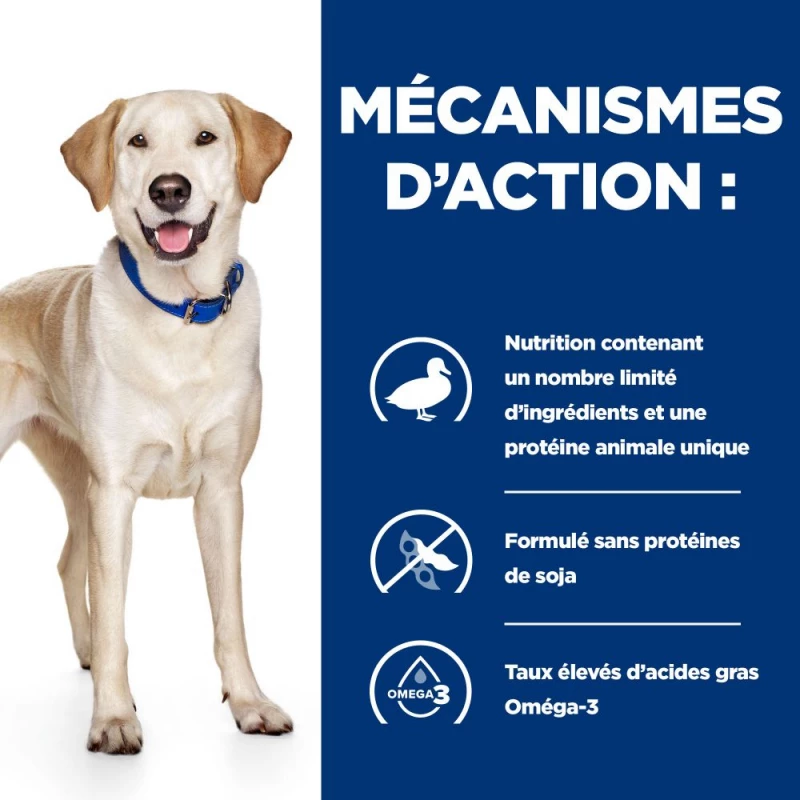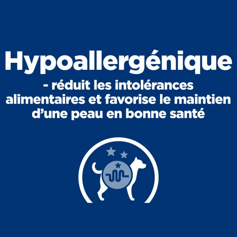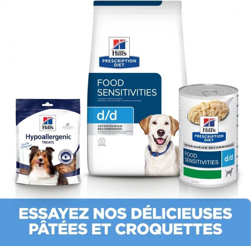 HILL’S Prescription Diet D/D Food Sensitivities is een dieetvoeding bedoeld voor volwassen honden die lijden aan voedselgevoeligheid (intoleranties, allergieën) die dermatologische of spijsverteringsproblemen veroorzaken.
