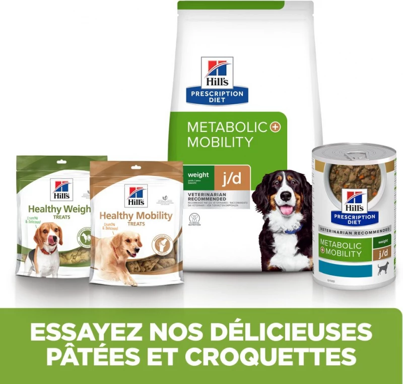 HILL’S Prescription Diet Metabolic + Mobility is speciaal samengesteld om te voldoen aan de behoeften van honden met overgewicht en gewrichtsproblemen.