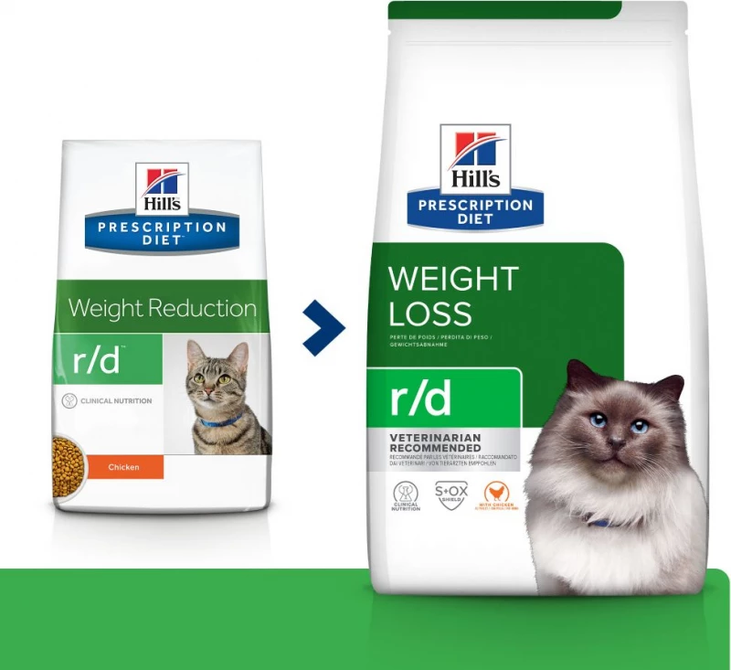 HILL’S Prescription Diet R/D Weight Reduction is een medisch en therapeutisch caloriearm dieet speciaal aangepast om obesitas te verminderen en gewichtsverlies bij volwassen katten te vergemakkelijken. Overgewicht kan niet alleen de mobiliteit van de kat verminderen, maar het kan ook artritis, diabetes mellitus of hartaandoeningen veroorzaken. Obesitas kan ook de levensverwachting van het dier verminderen. Het beheren en beheersen van het gewicht van je kat is daarom essentieel. Hill’s Prescription Dieta bevat weinig vet, calorieën en veel vezels en helpt je ??kat af te vallen en zich vol te voelen. Hun hoge gehalte aan L-carnitine helpt vet te verbranden terwijl de spiermassa behouden blijft. Dit dieet zorgt voor een goed beheer en een goede gewichtscontrole van je dier.