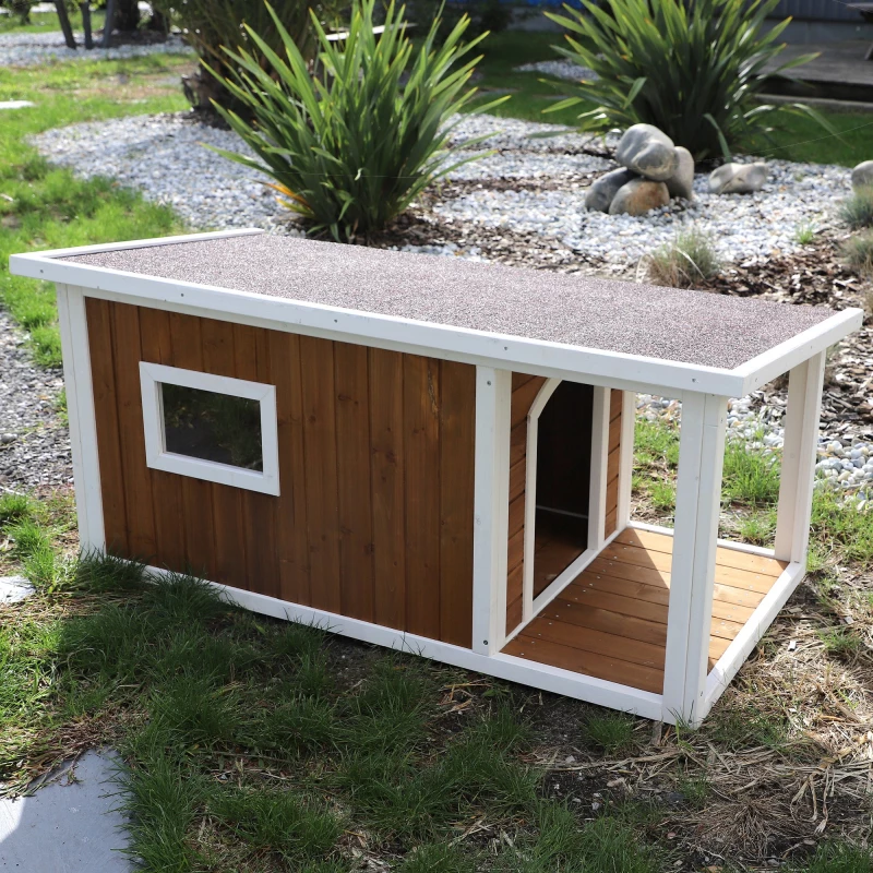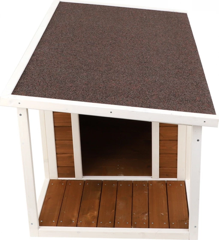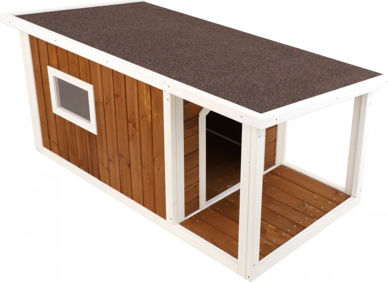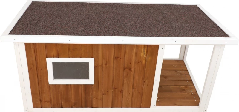 Het asfalt- en waterdichte dak gaat volledig open; wat een groot pluspunt is voor het schoonmaken van de binnenkant van het hondenhok. Het hondenhok en het terrasgedeelte zijn voorzien van een overkapping met een afdak, die je hond beschermt tegen regen en tocht.
