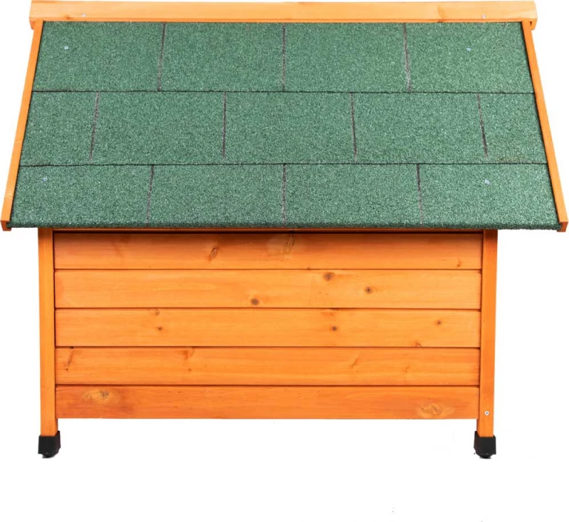 Het dennenhout waaruit het hok gemaakt is, is vooraf bewerkt om resistent te zijn tegen onguur weer. De pootjes onder het hok vermijden het contact met de vochtige bodem. Het groene dak – uit geteerd asfalt – zorgt voor een decoratief en aangenaam effect in je tuin.
