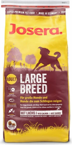 JOSERA Large Breed zijn hondenbrokken voor grote rassen ontwikkeld om te voldoen aan de behoeften van grote volwassen honden van meer dan 25/30 kg. Dit glutenvrije dieet is rijk aan essentiële vetzuren, van nature aanwezig in zalm (omega 3). Ze versterken het immuunsysteem, bevorderen de algemene gezondheid van vitale functies, sterke gewrichten, een glanzende vacht en een gezonde huid. Zalm is een licht verteerbare bron van vlees dat zorgt voor een optimale opname van alle essentiële voedingsstoffen. Het hoge vezelgehalte voldoet aan de eisen van de hond en voorkomt frustratie. In combinatie met een geschikte (grotere) brokkenmaat zijn ze perfect voor vraatzuchtige honden die niet de tijd nemen om goed te kauwen en steeds om eten vragen.