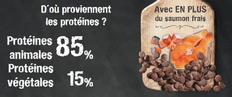 Kippenvleesmeel, rijst, kippenmaïs, vet (geconserveerd met een mengsel van tocoferolen, een bron van vitamine E), zalmolie, kippeneiwitten, gedehydrateerd, natuurlijke aroma’s, gedroogde appels, biergist, yucca schidigera-extract, mineralen, DL-methionine, L-Lysine, mannan-oligosachariden, fructo-oligosachariden.