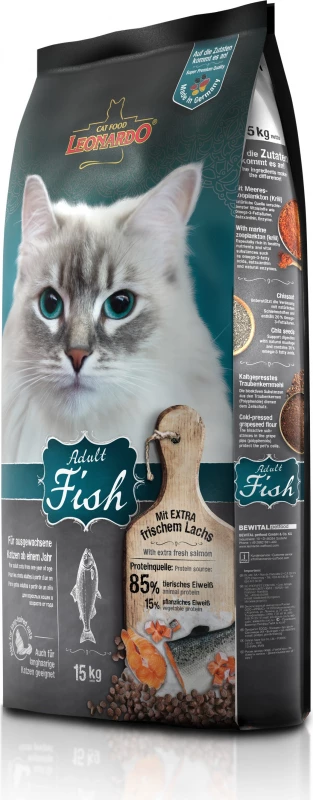 Leonardo Adult Fish voor katten heeft een bijzonder smakelijke smaak met meer dan 30% verse zalm die geschikt is voor alle katten (ook die met lang haar).