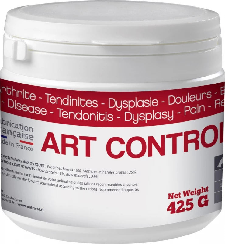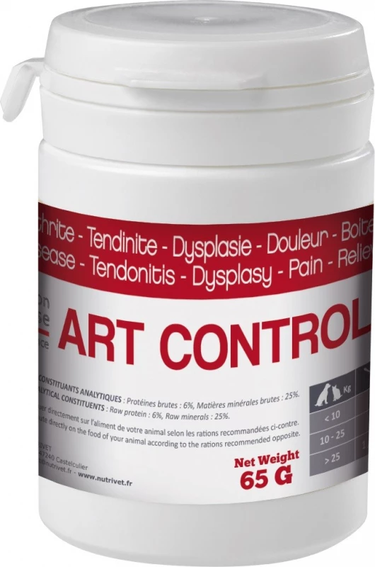 Nutrivet Art Control, rijk aan chondroïtinesulfaat, bevordert de sterkte van het kraakbeen en de regeneratie van de gewrichten van je hond of kat. Dit poeder bestrijdt ontstekingspijn en vermindert verlammingsverschijnselen. Dit voedingssupplement draagt ??ook bij aan de soepelheid en elasticiteit van de gewrichten. Art Control is geschikt voor alle leeftijden en rassen.