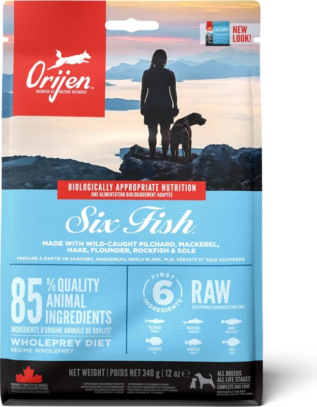 – ORIJEN SIX FISH bevat 38% voedzame eiwitten en niet meer dan 18% laagglykemische koolhydraten, voor de voeding van honden zoals die evolutionair en biologisch vereist is.