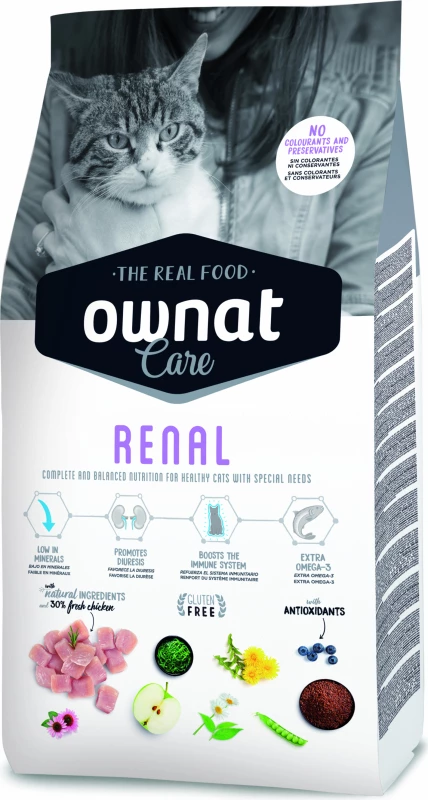 Ownat Care Renal is een complete en uitgebalanceerde voeding voor volwassen katten van alle rassen die onderhevig zijn aan nierproblemen. Deze brokjes bevatten een afgemeten dosis mineralen en aromatische planten die diurese bevorderen en zo bijdragen aan een gezonde nierfunctie. Laag in mineralen om de gezondheid van de urinewegen te ondersteunen en met een hoog gehalte aan omega 3 om het immuunsysteem te versterken. Bovendien bevorderen de aromatische planten in dit recept meer plassen bij je kat.