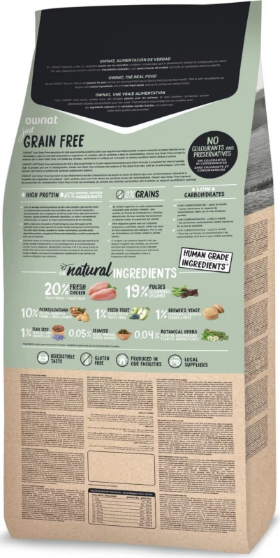 Het OWNAT Just Grain Free-assortiment is een graanvrij, eiwitrijk en koolhydraatarm hondenvoer voor volwassen honden. Het is vergelijkbaar met het oorspronkelijke dieet van honden die in hun wilde omgeving bijna uitsluitend vlees en zeer weinig koolhydraten consumeren, die sterk aanwezig zijn in granen. Just Grain Free Adult graanvrije kippenbrokjes voor volwassen honden zijn gemaakt met verse, lokale ingrediënten.