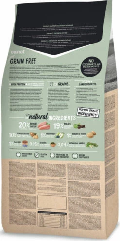 De producten van het gamma Just Free van Ownat zijn graanvrij, hebben een hoog eiwitgehalte (meer dan 65% van de eiwitten zijn van dierlijke oorsprong) en zijn laag in koolhydraten. Ownat heeft als doel om de natuurlijke voeding van de hond te benaderen: rijk aan vlees en arm aan suikers (die ruim aanwezig zijn in een voeding gebaseerd op granen).