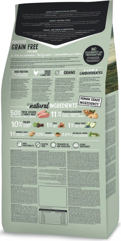 Om honden een voeding aan te bieden die zo dicht mogelijk aanleunt bij hun natuurlijke behoeften, heeft het merk Ownat het Prime Grain Free-assortiment gecreëerd, dat vrij is van granen, rijk aan eiwitten en arm aan koolhydraten, waarbij koolhydraten normaal in grote hoeveelheden aanwezig zijn in granen.