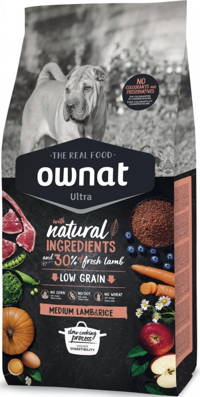 Droogvoer van OWNAT ULTRA Lamb & Rice wordt aanbevolen voor gevoelige volwassen honden (meer dan één jaar) van alle rassen. De zeer verteerbare ingrediënten voor dit recept verminderen en voorkomen spijsverteringsstoornissen en/of de huidaandoeningen. De opname van vers kippenvlees verbetert de smaak en zorgt voor een optimale opname van voedingsstoffen die essentieel zijn voor de gezondheid door middel van hoogwaardige eiwitten. De toevoeging van chondroïtinesulfaat en glucosamine bevordert de ontwikkeling van gewrichten en kraakbeen in optimale omstandigheden. OWNAT ULTRA Lam & Rijst is gemaakt van 30% vers vlees en natuurlijke ingrediënten rijk aan vitaminen en mineralen.