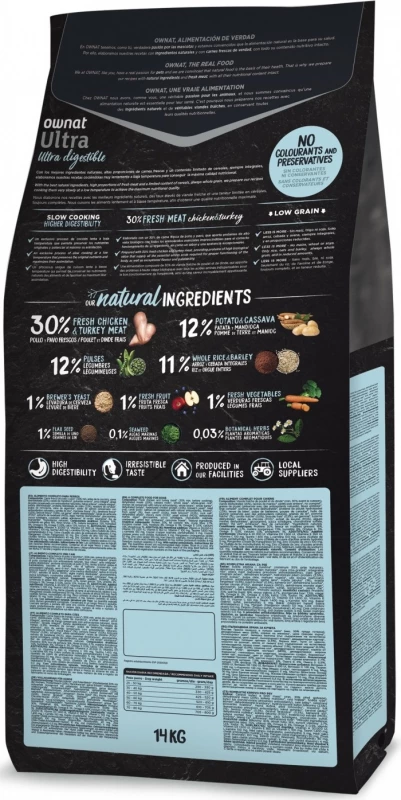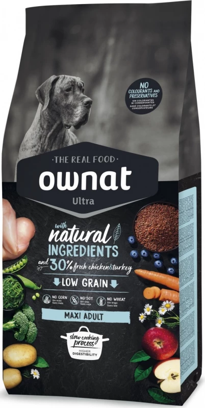 OWNAT ULTRA Maxi Adult hondenvoer wordt aanbevolen voor grote volwassen honden (> 28 kg) ouder dan een jaar. De verwerking van vers kippenvlees verhoogt de smaak en zorgt voor een optimale opname van voedingsstoffen die essentieel zijn voor de gezondheid door middel van hoogwaardige eiwitten. Dit hondenvoer heeft een hoge energie-inname en veel eiwitten om de goede werking van alle vitale functies te bevorderen. De toevoeging van chondroïtine, sulfaat en glucosamine bevordert de ontwikkeling van gewrichten en kraakbeen onder optimale omstandigheden. OWNAT ULTRA Maxi Adult hondenbrokken zijn samengesteld uit 30% vers vlees en ingrediënten die van nature rijk zijn aan vitamines en mineralen.