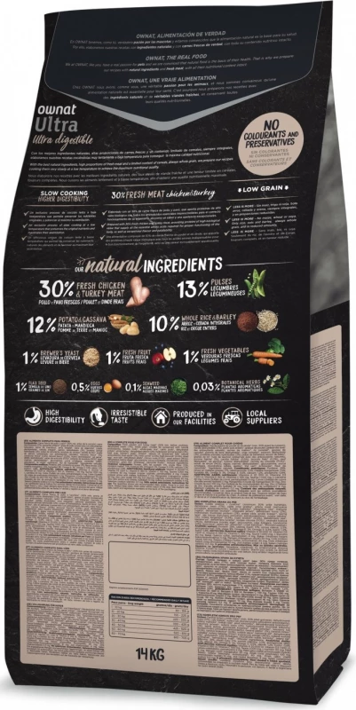 OWNAT ULTRA Medium Adult hondenvoeding wordt aanbevolen voor volwassen honden van gemiddelde grootte (10 kg – 28 kg) ouder dan een jaar. De verwerking van vers kippenvlees verhoogt de smaak en zorgt voor een optimale opname van voedingsstoffen die essentieel zijn voor de gezondheid door middel van hoogwaardige eiwitten. Dit hondenvoer heeft een hoge energie-inname en veel eiwitten om de goede werking van alle vitale functies te bevorderen. De toevoeging van chondroïtine, sulfaat en glucosamine bevordert de ontwikkeling van gewrichten en kraakbeen onder optimale omstandigheden. OWNAT ULTRA Medium Adult hondenvoer is gemaakt van 30% vers vlees en ingrediënten die van nature rijk zijn aan vitamines en mineralen.