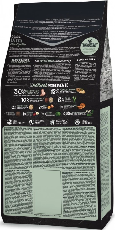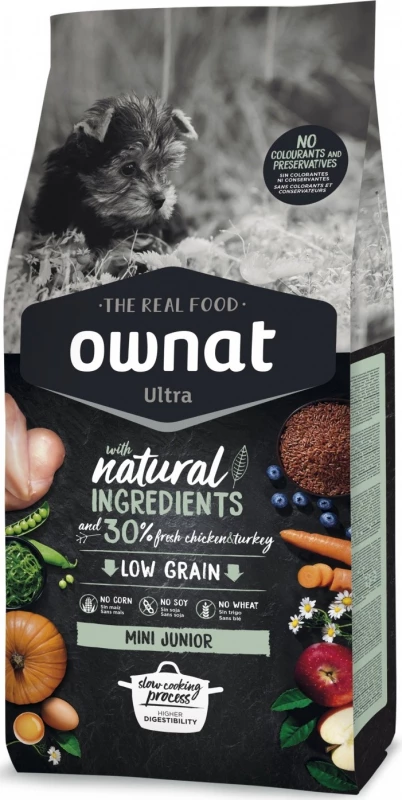 OWNAT ULTRA Mini Junior hondenvoer wordt aanbevolen voor puppy’s van kleine rassen (<10kg volwassen gewicht) tot ongeveer 10 maanden oud. De verwerking van vers kippenvlees verhoogt de smakelijkheid en zorgt voor een optimale opname van voedingsstoffen die essentieel zijn voor de gezondheid door middel van hoogwaardige eiwitten. Dit puppyvoer heeft een hoge energie- en eiwitinname om de ontwikkeling van de spieren te bevorderen. De toevoeging van chondroïtine, sulfaat en glucosamine bevordert de ontwikkeling van gewrichten en kraakbeen onder optimale omstandigheden. OWNAT ULTRA Mini Junior is samengesteld uit 30% vers vlees en ingrediënten die van nature rijk zijn aan vitamines en mineralen. Het brengt alle nodige energie voor jonge honden in de groei. De fosfor-calciumverhouding zorgt voor een solide groei van botten en tanden.