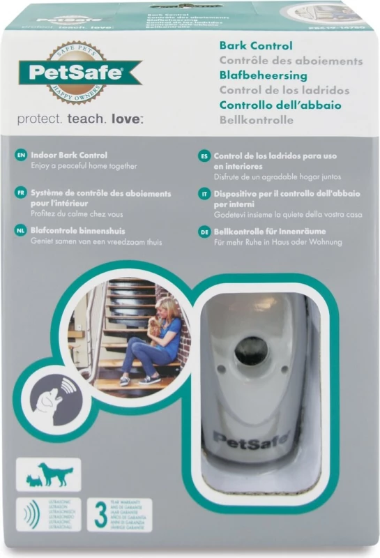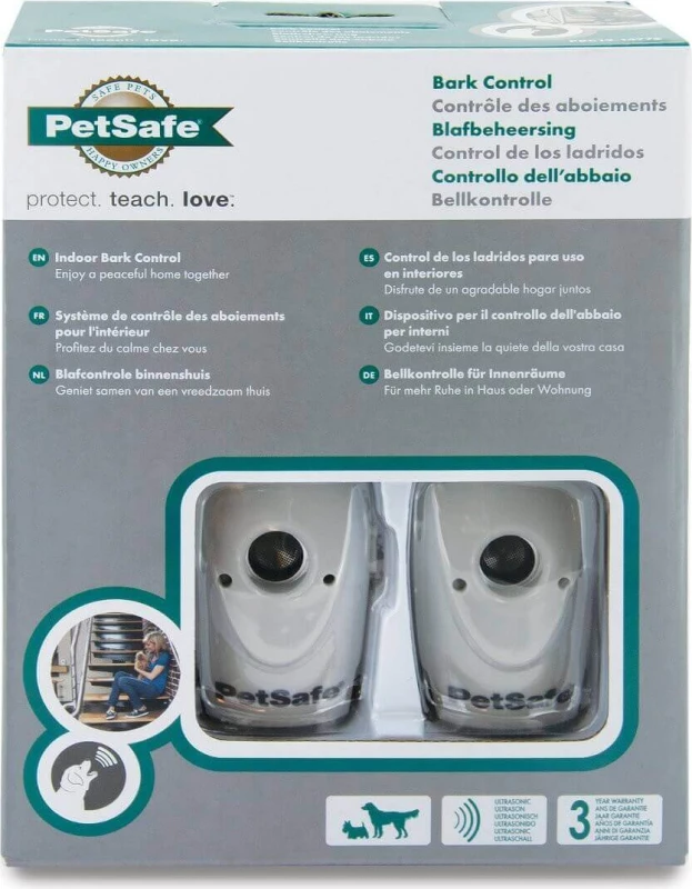 Het ongewenste blaffen van een hond kan al snel een probleem worden met de buurt. Daarom heeft het merk PETSAFE dit apparaat ontwikkeld: de Indoor Bark Control. Dit binnensysteem wordt automatisch geactiveerd wanneer het geblaf van de hond wordt gedetecteerd. Het is geschikt voor één of meerdere honden en vereist geen gebruik van een halsband. Wanneer het blaffen binnen een straal van 8 meter wordt waargenomen, zendt het een echo uit die de hond ervan weerhoudt om te blaffen.