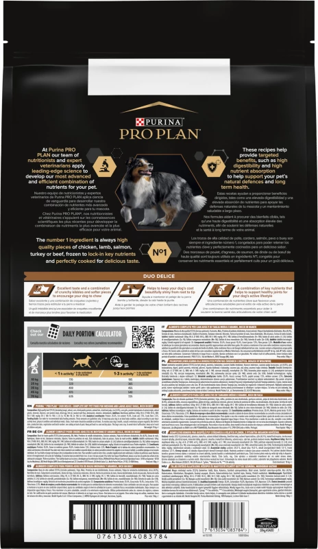 Purina Pro Plan Adult – Duo Délice biedt een 100% complete en uitgebalanceerde voeding met de juiste mix van voedingsstoffen om de gezondheid en het welzijn van jouw hond te ondersteunen. Duo Délice helpt ook om het gebit en spijsvertering gezond te houden. Duo Délice is ontwikkeld met een combinatie van krokante brokjes en malse stukjes. Op deze manier kan je hond genieten van de smakelijke brokken en toch de essentiële voedingsstoffen binnen krijgen.