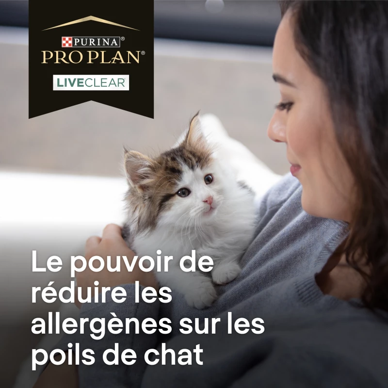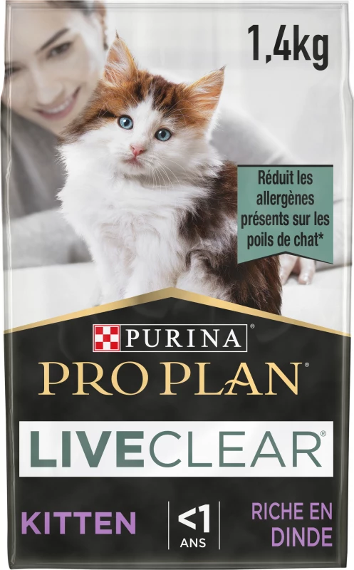 Het Pro Plan Liveclear-assortiment biedt voedsel dat allergenen op kattenhaar vermindert. Pro Plan Liveclear brokjes bieden een complete en uitgebalanceerde dagelijkse voeding voor kittens. Met een smakelijke kalkoensmaak verminderen ze effectief en veilig allergenen op kattenhaar en huidschilfers, vanaf drie weken dagelijkse voeding.