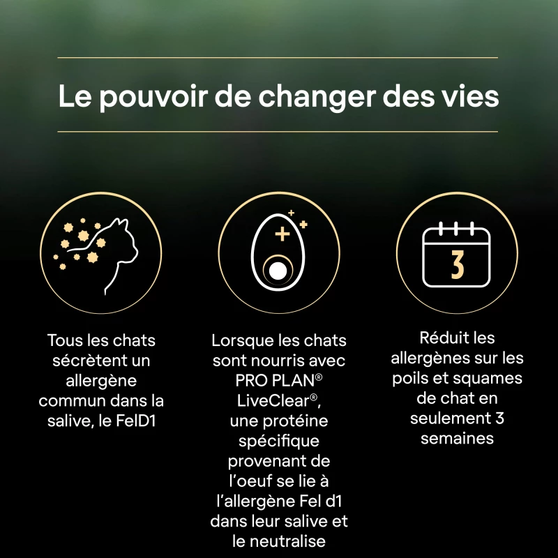 Het Pro Plan Liveclear-assortiment biedt voedsel dat allergenen op kattenhaar vermindert. Pro Plan Liveclear brokjes bieden een complete en uitgebalanceerde dagelijkse voeding voor gesteriliseerde katten ouder dan één jaar. Met een smakelijke kalkoensmaak verminderen ze effectief en veilig allergenen op kattenhaar en huidschilfers, vanaf drie weken dagelijkse voeding.