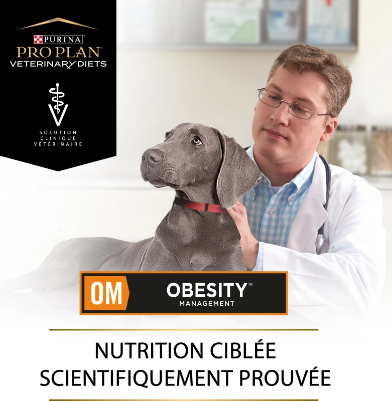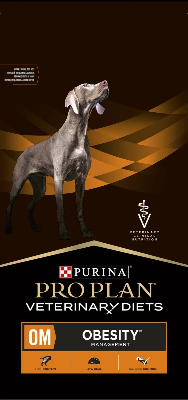 Purina Pro Plan Veterinary Diets – OM Obesity Management hondenvoer is speciaal voor de behandeling van overgewicht en corpulentie bij honden. Zijn formule, met een laag vetgehalte, een beperkt aantal calorieën en een hoog vezelgehalte, helpt honden gewicht te verliezen. De proteïnen stimuleren de stofwisseling en daardoor de gewichtsafname, zonder de spiermassa te verminderen.