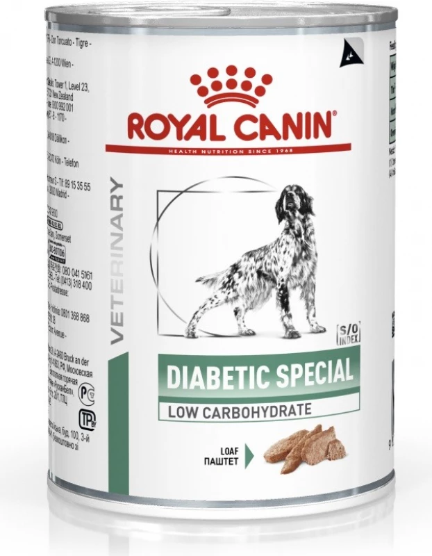 Royal Canin Veterinary Diets Diabetic Special blikvoer is een volledig dieetvoer voor honden met diabetes mellitus. Om een ??goede gezondheid te behouden, is het essentieel om hun bloedsuikerspiegel te reguleren door middel van een aangepast medisch dieet. Deze voeding bevat een laag gehalte aan snelle koolhydraten die glucose vrijgeven.
